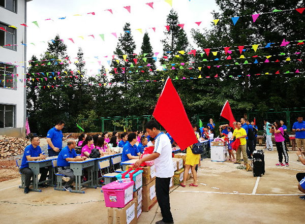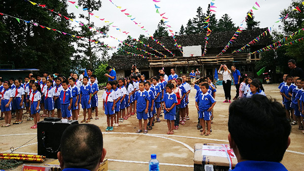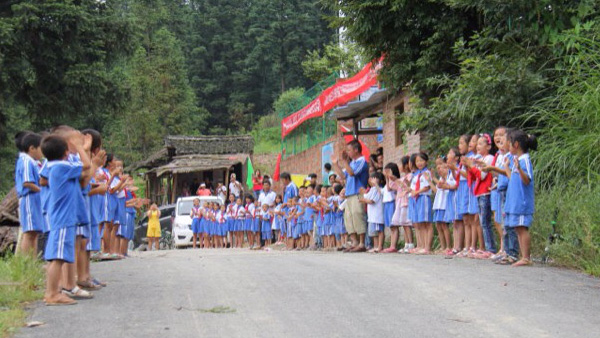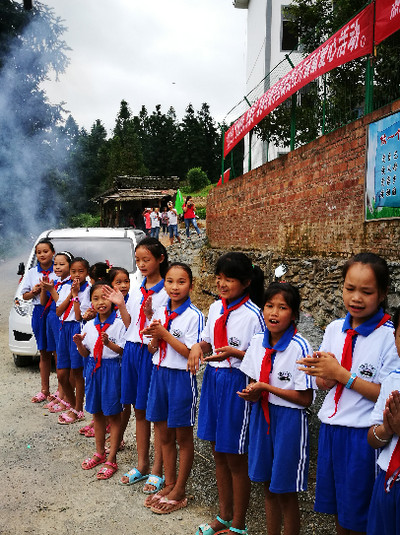 23家连锁企业代表于27日早七点从贵阳出发,乘坐大巴,前往平永镇修文小学。经过五个小时的车程终于抵达榕江县,不过艰难的旅程才刚刚开始,从榕江县到修文小学还有42公里车程,其中26公里是县道,16公里是山路。由于才下过暴雨,道路多处塌方,大巴车行驶县道都非常困难,根本无法驶入学校,由于有物资需要带到学校,会务组联系了学校和县团委,临时调动了当地的面包车迎接我们的爱心团队,在换乘等候车辆时,大家纷纷表示:“只要有路,咱们走也要走进去。我们本就是来帮助同学们的,怎么还能麻烦乡亲们呢?”下午14:30,经过九曲十八弯的盘山公路,我们终于到达修文小学,当地政府代表、老师和同学们列队迎接,呼喊着:“欢迎欢迎,热烈欢迎!”看着他们淳朴的面孔,感受到他们发自内心的那种开心,我们的眼前朦胧了。我们陆续进入学校,在与校长和师生们短暂的交流后,便正式开始捐赠活动。